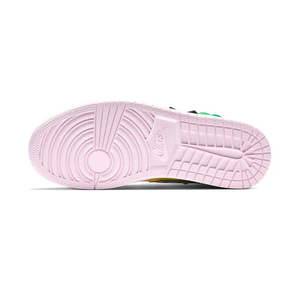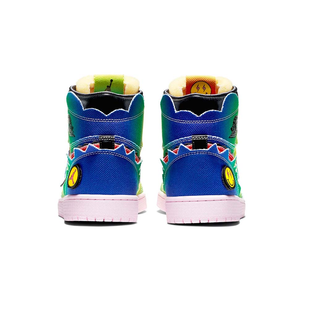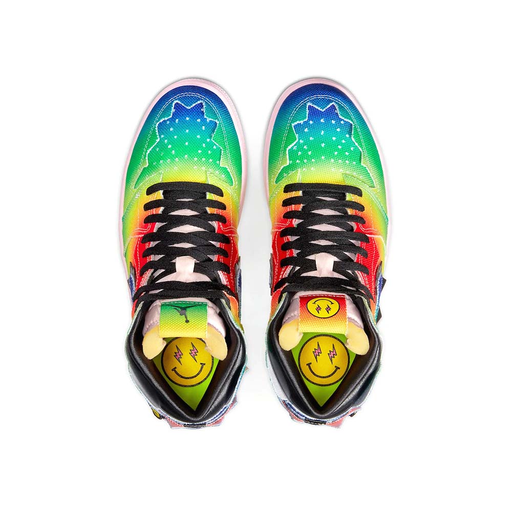 The J Balvin x Air Jordan 1 High OG “Colores Y Vibras” is a Holiday 2020 collaboration between the popular Latin artist and Jordan Brand on Michael Jordan’s first signature shoe. With the release of the “Colores Y Vibras,” which translates to “Colors and Vibes” in English, the Colombia native becomes the first Latin musician to collaborate with Jordan Brand, a monumental achievement. As for the design, the upper features a canvas construction with a rainbow-like assortment of colors baked into its look. Jagged panels on the collar, eyelets, heel, and forefoot further the singular look of J Balvin’s design. Other details include multicolor sewn-on Swooshes on either side, a black “Wings” emblem on the collar, and a pink nylon tongue with mismatching tongue tags that feature an orange patch with a black Jumpman on the right shoe and a green patch with a yellow smiley face on the left shoe.