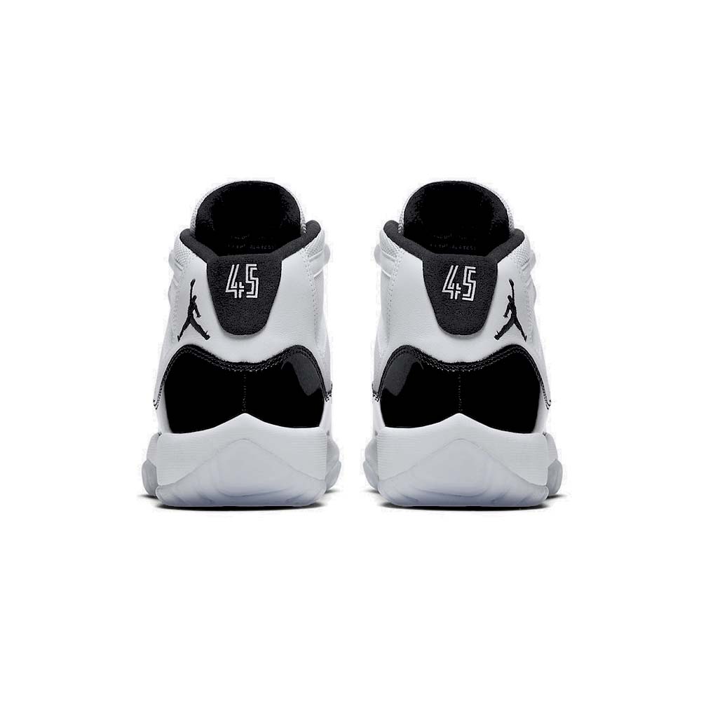 The Air Jordan 11 GS “Concord 2018” is the grade school-sized release of one of the most important sneakers of all time. This retro features the beloved design in its most accurate form since the original that Michael Jordan wore on court in 1996. The Air Jordan 11 GS “Concord 2018” features the same white ballistic mesh and leather upper with shining black patent leather construction as the men’s sizing. The kids’ Concord colorway also features “45” on each heel, referencing the original pair Jordan debuted in the 1995 NBA Playoffs. Michael Jordan wore number 45 when he returned to the NBA after his first retirement in 1994, and the number was on the very first pairs of the Air Jordan 11.