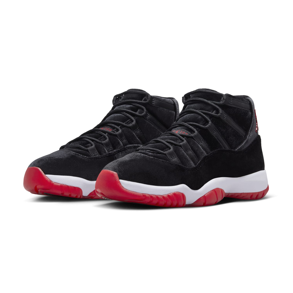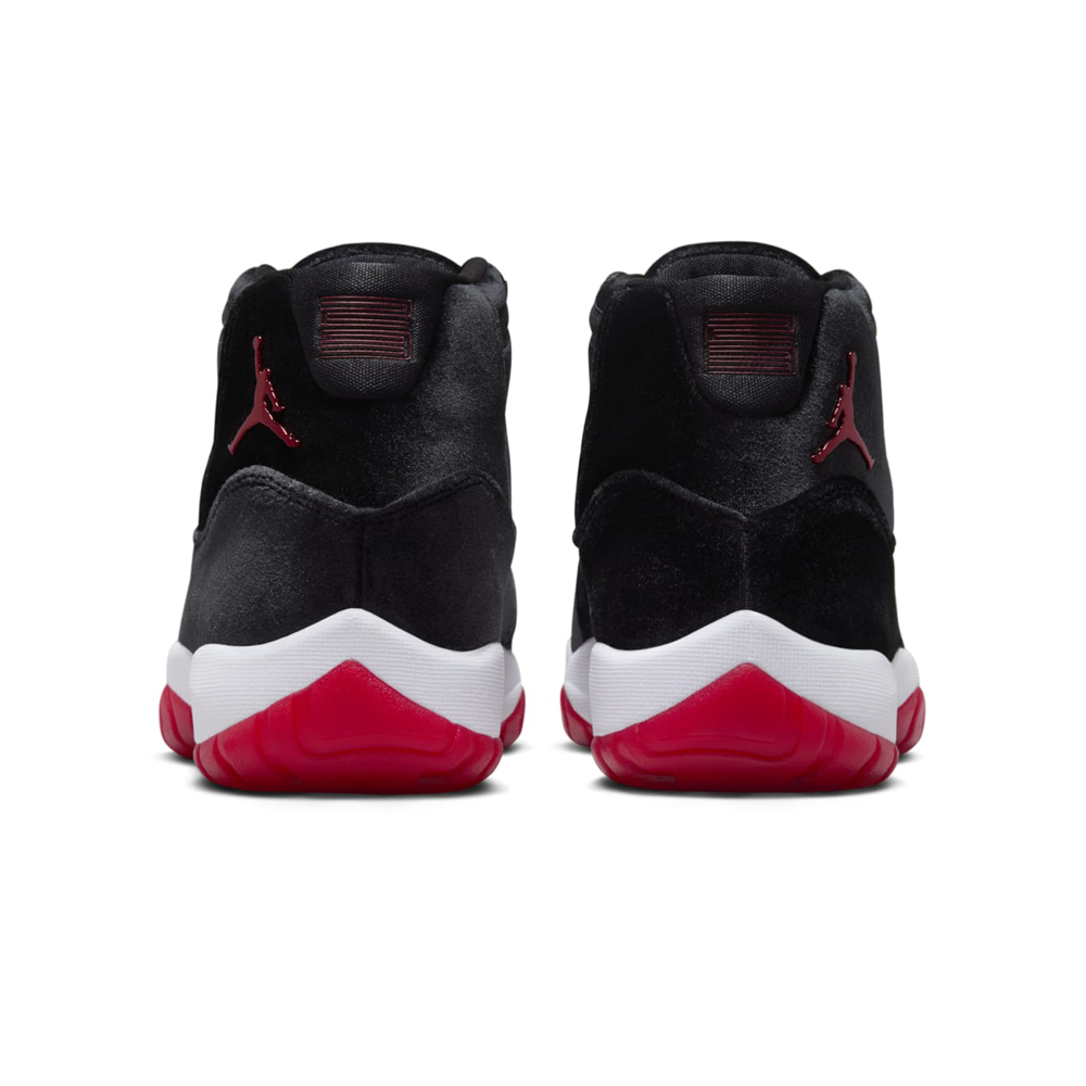 The Air Jordan 11 “Bred Velvet” is a luxurious twist on the classic silhouette. Featuring a plush black velvet upper, reminiscent of the 2016 “Velvet Night Maroon”, this exclusive release boasts Varsity Red accents on the Jumpman logos and outsole, delivering the iconic “Bred” aesthetic. White detailing on the “23” heel, tongue branding, and midsole completes the timeless design.